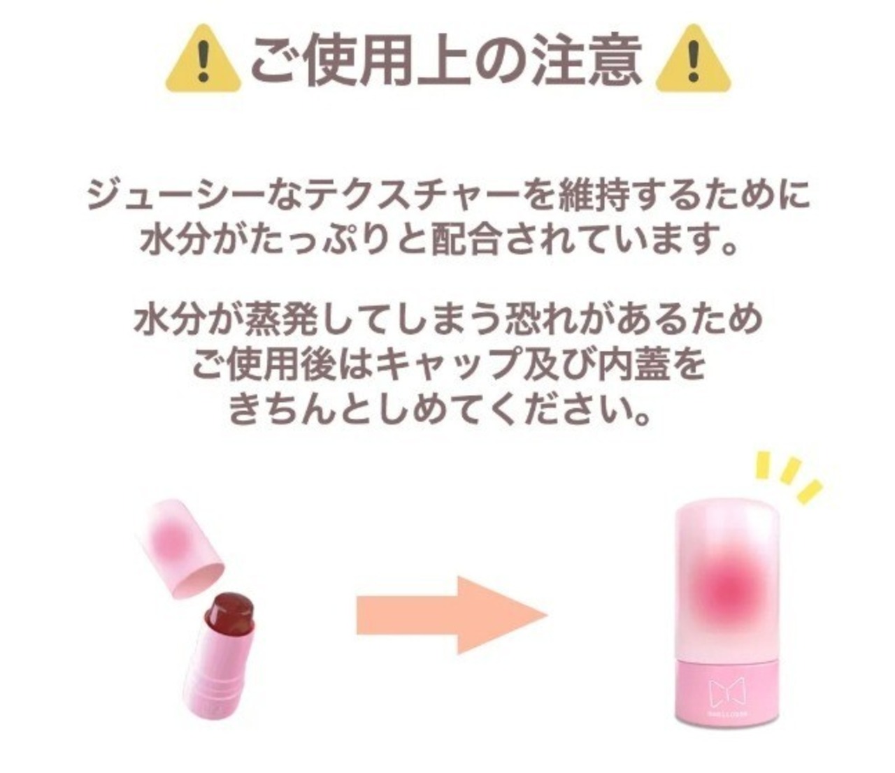 ・中身を適量(1~2mm程度)くり出し、頬・唇に塗布し、なじませてください。