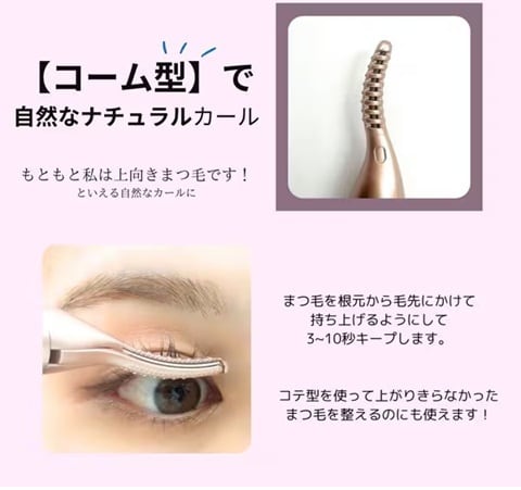 ◎「コテ」のようにまつ毛を「挟む」と「熱」の力でぱっちり上げられ、流行のまつ毛パーマのような仕上がりに