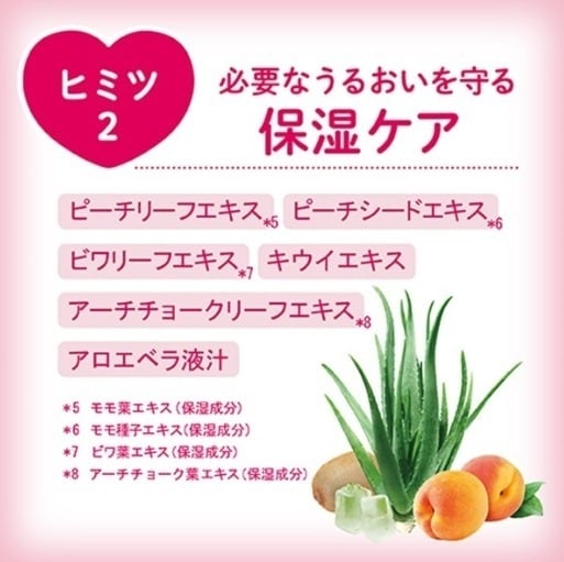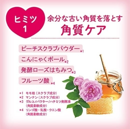 石ケン素地、水、モモ核、マンナン、グルコノバクター/ハチミツ発酵液、リンゴ酸、乳酸、クエン酸、モモ葉エキス、モモ種子エキス、ビワ葉エキス、キウイエキス、アーチチョーク葉エキス、アロエベラ液汁、グルコース、チャ葉エキス、グリセリン、塩化Na、BG、EDTA-4Na、エチドロン酸、エチドロン酸4Na、酸化鉄、香料